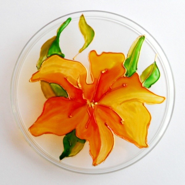 Sklenená tácka zdobená vitrážovými farbami. Priemer cca 10 cm. Možné zavesiť na stenu.