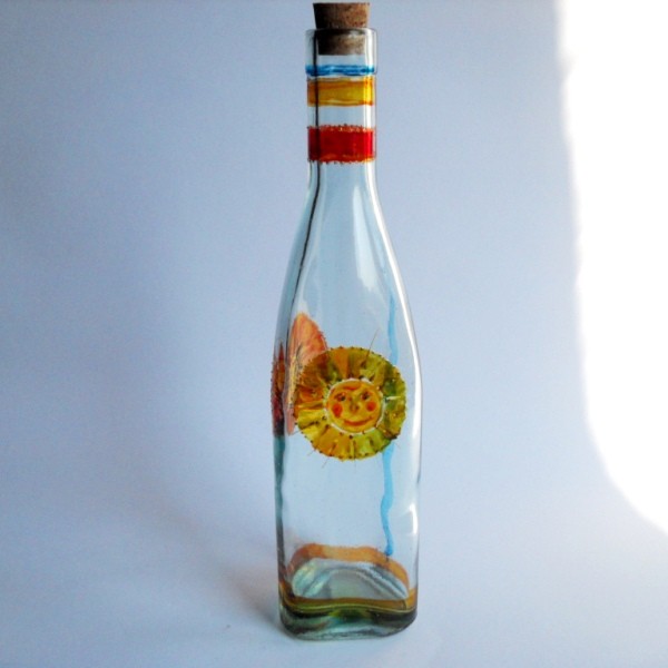 Sklenená flaša zdobená vitrážovými farbami. Objem cca 300ml. Výška cca 25 cm.