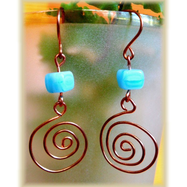 Visiace náušnice z medeného drôtu a sklenených korálok.
