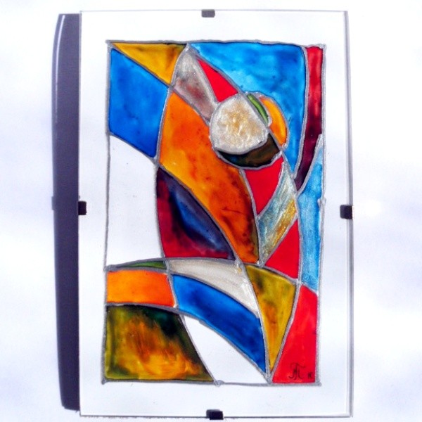 Maľba na sklo striebornou kontúrovacou farbou a vitrážovými farbami. Veľkosť cca 10 x 15 cm.