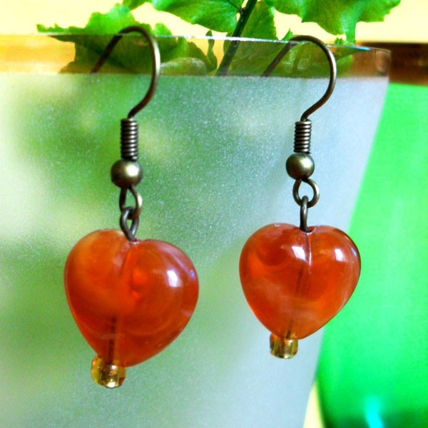 Visiace náušnice zo sklenených korálok, mosadzného drôtu a mosadzným afroháčikom.