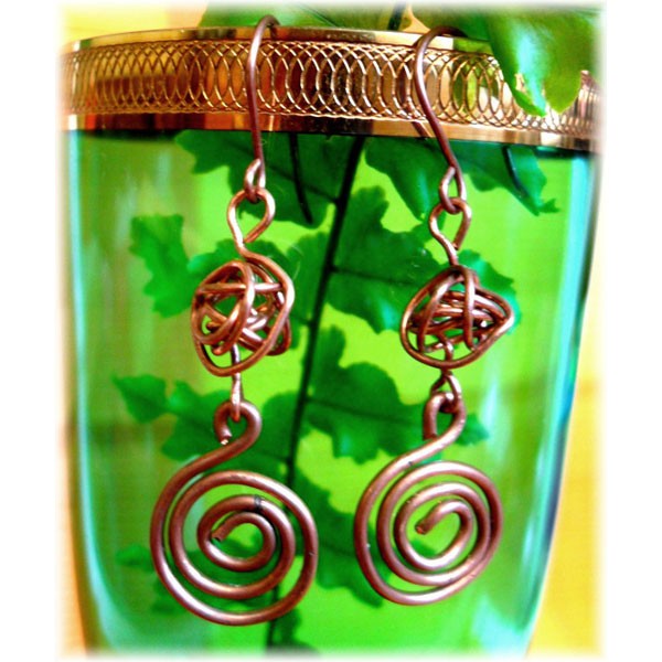 Visiace náušnice z medeného drôtu, veľkosť bez háčika cca 4 cm.