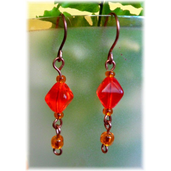 Visiace náušnice z medeného drôtu a sklenených korálok.