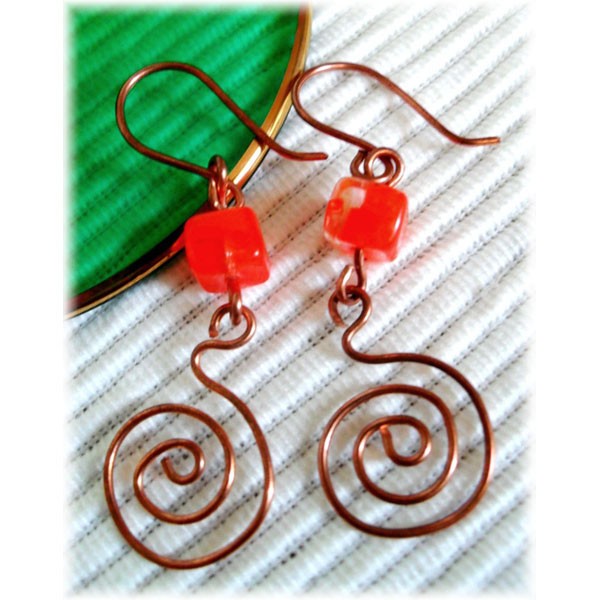 Visiace náušnice z medeného drôtu a sklenených korálok.