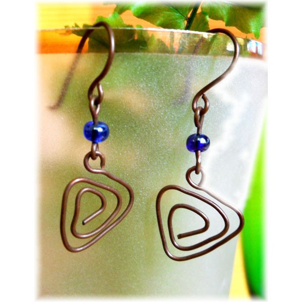 Visiace náušnice z medeného drôtu a sklenených korálok.