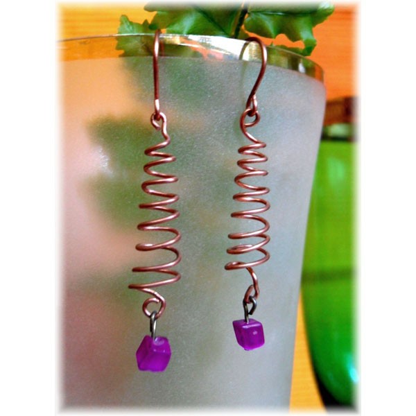 Visiace náušnice z medeného drôtu a sklenených korálok.