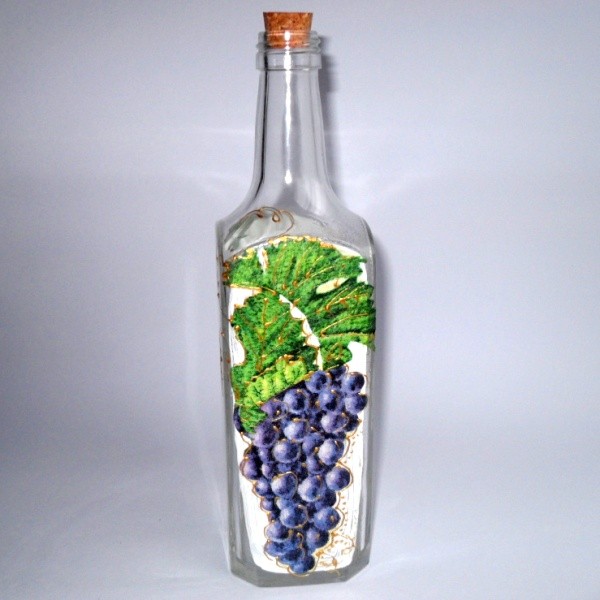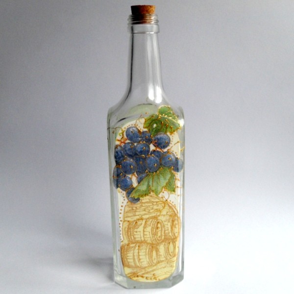 Sklenená flaša zdobená technikou decoupage a zlatou kontúrovacou farbou na sklo. Objem cca 500 ml. Výška cca 17cm.