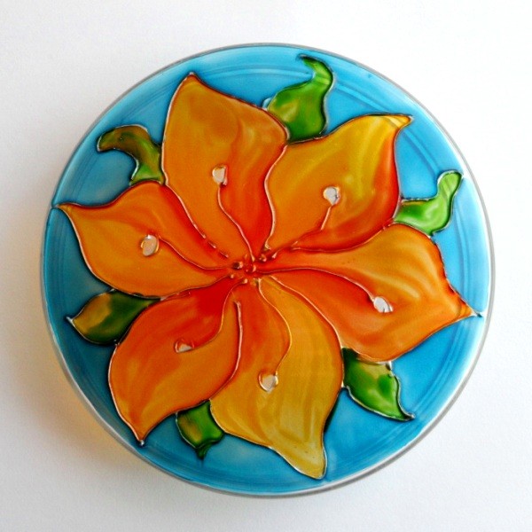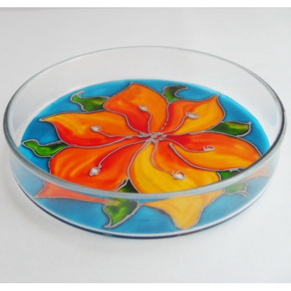 Sklenená tácka zdobená vitrážovými farbami. Priemer cca 9 cm. Možné zavesiť na stenu.
