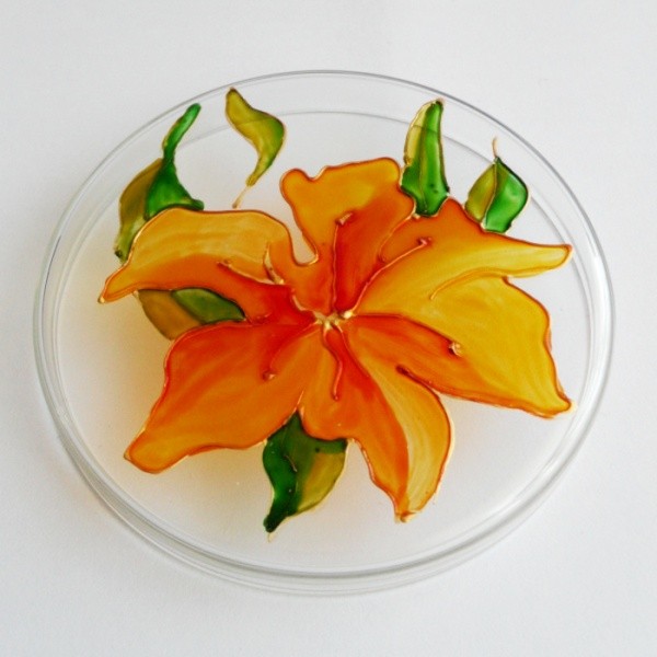 Sklenená tácka zdobená vitrážovými farbami. Priemer cca 10 cm. Možné zavesiť na stenu.