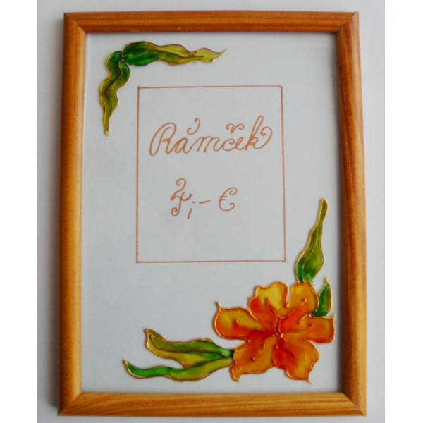 Fotorámček zdobený vitrážovými farbami. Veľkosť cca 18,5x14 cm.