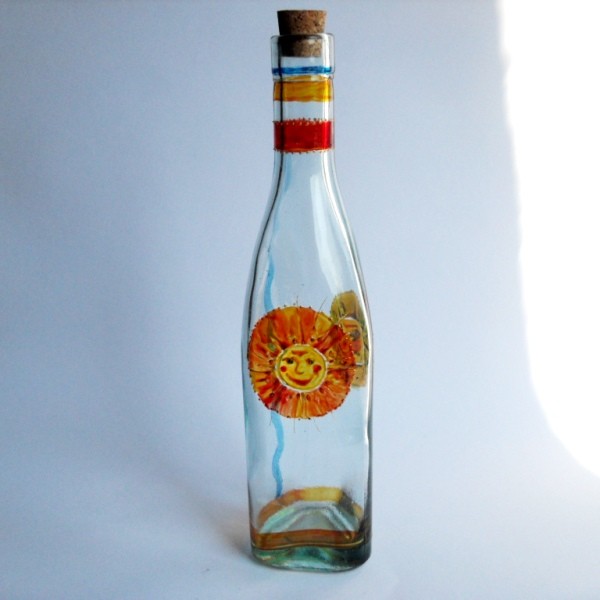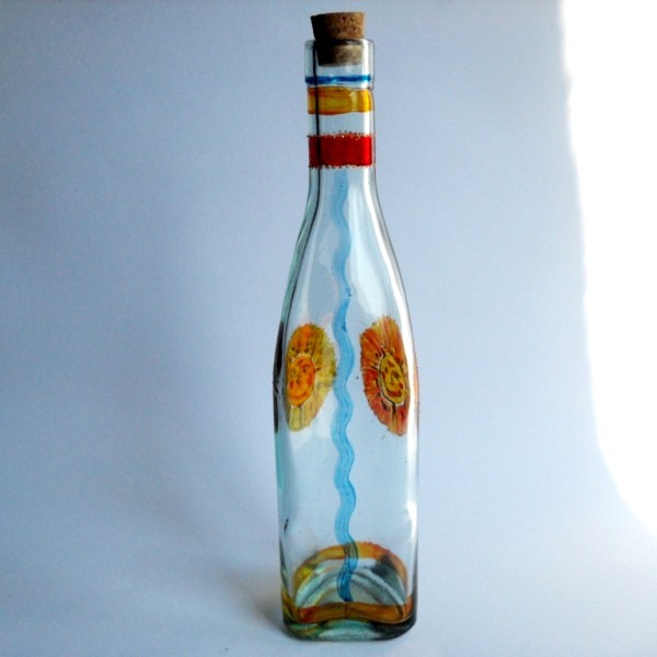 Sklenená flaša zdobená vitrážovými farbami. Objem cca 300ml. Výška cca 25 cm.