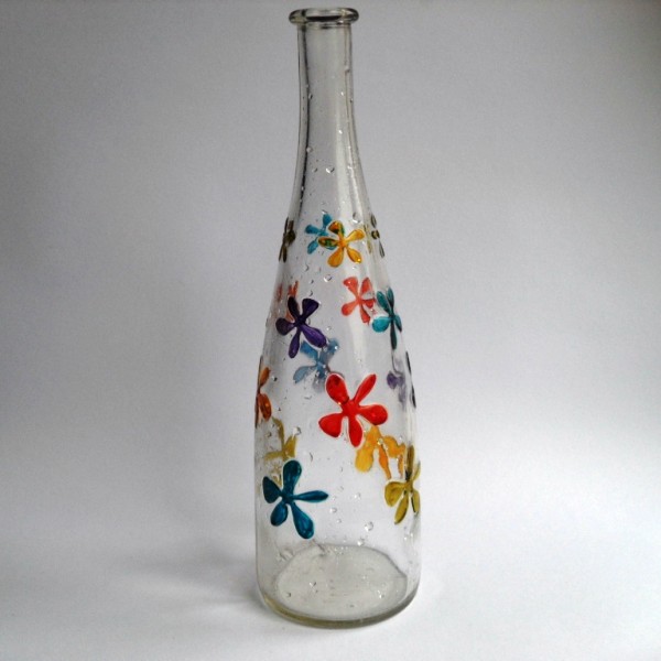 Sklenená flaša zdobená vitrážovými farbami. Objem cca 800ml. Výška cca 23 cm.