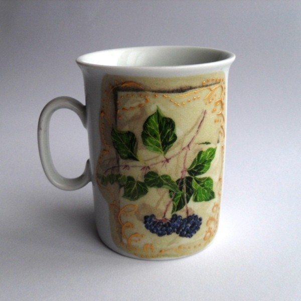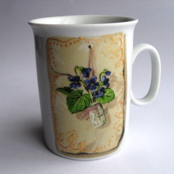 Porcelánová šálka zdobená technikou decoupage a zlatou kontúrovacou farbou na keramiku. Objem cca 250 ml. Výška cca 9,5 cm.