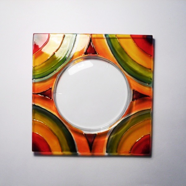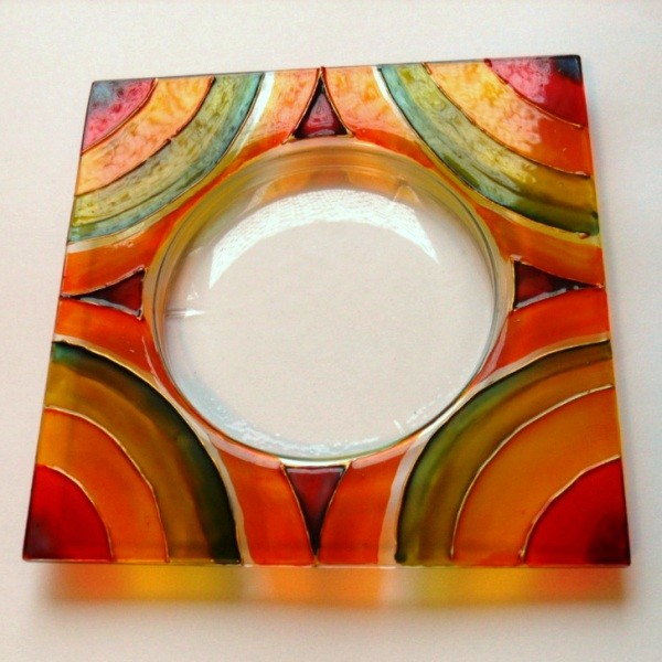 Sklenený svietnik zdobený vitrážovými farbami. Veľkosť cca 13x13 cm.