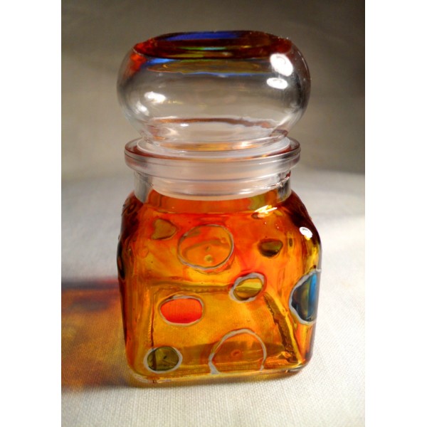 Sklenená fľaštička zdobená vitrážovými farbami na sklo. Veľkosť cca 5 x 9 cm. Objem cca 100ml.