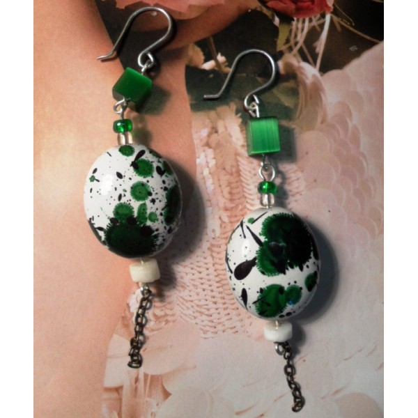 Visiace náušnice z postriebreného drôtu,umelých a sklenených korálok, veľkosť bez háčika cca 7,5 cm.
