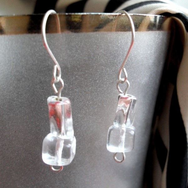 Visiace náušnice z postriebreného drôtu a sklenených korálok, veľkosť bez háčika cca 2 cm.