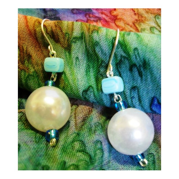 Visiace náušnice z postriebreného drôtu,umelých a sklenených korálok, veľkosť bez háčika cca 3,5 cm.