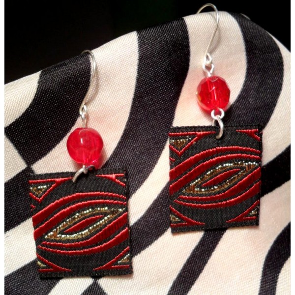 Visiace náušnice z postriebreného drôtu, sklenených korálok a textilu.