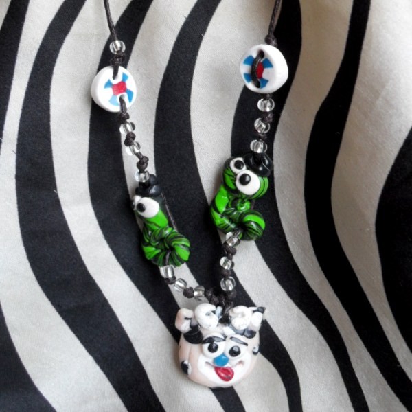 Prívesok z fimo hmoty a korálok na čiernej voskovanej koženej šnúrke, veľkosť cca 2,5x9 cm.