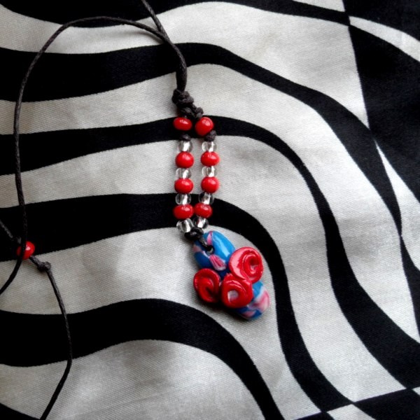 Prívesok z fimo hmoty a korálok na čiernej voskovanej koženej šnúrke, veľkosť cca 2x6 cm.
