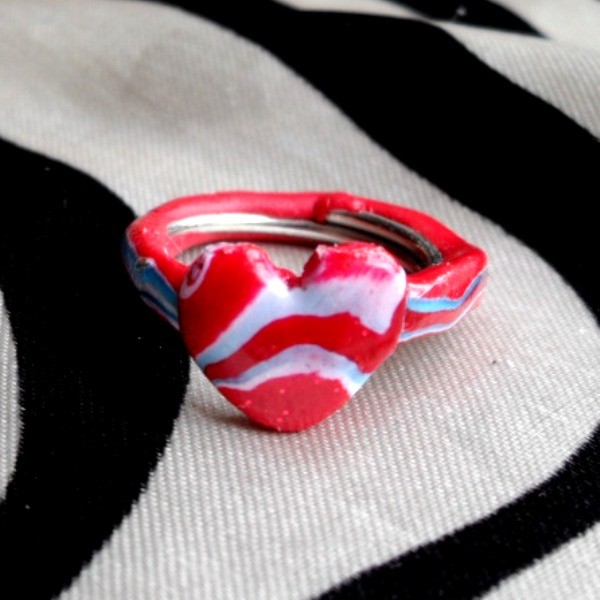 Prsteň z fimo hmoty a postriebreného krúžku. Priemer 1,8 cm. Pochádza z dielne výtvarníčky Evy Timkovej.