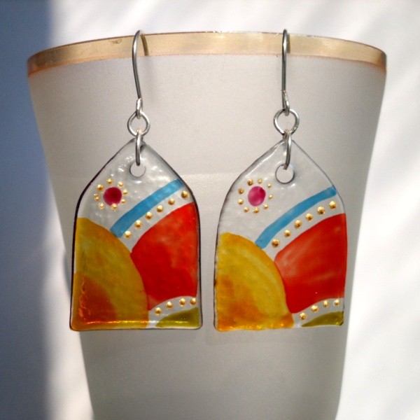 Visiace náušnice zo skla zdobeného vitrážovými farbami s postriebreným afroháčikom, veľkosť bez háčika cca 2,5x3,5 cm.