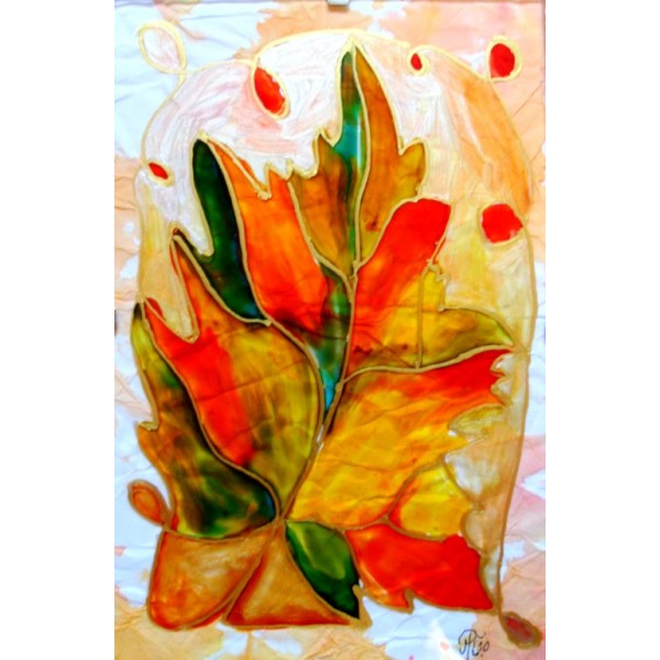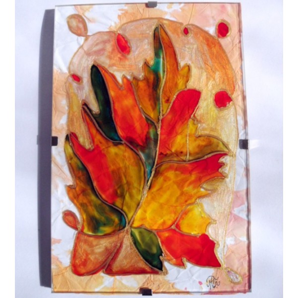 Maľba na sklo zlatou kontúrovacou farbou a vitrážovými farbami. Veľkosť cca 10 x 15 cm.