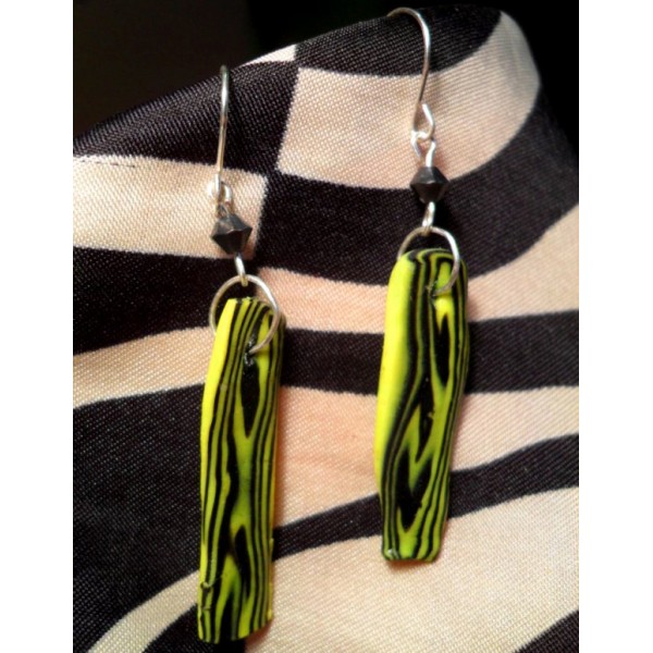 Visiace náušnice vyhotovené ručne z fimo hmoty, postriebreného drôtu, sklenených korálok a prelakované priesvitným lesklým lakom, veľkosť bez háčika cca 5 cm.
