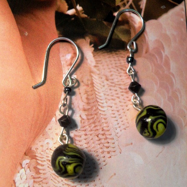 Visiace náušnice vyhotovené ručne z fimo hmoty, postriebreného drôtu, sklenených korálok a prelakované priesvitným lesklým lakom, veľkosť bez háčika cca 3,5 cm.