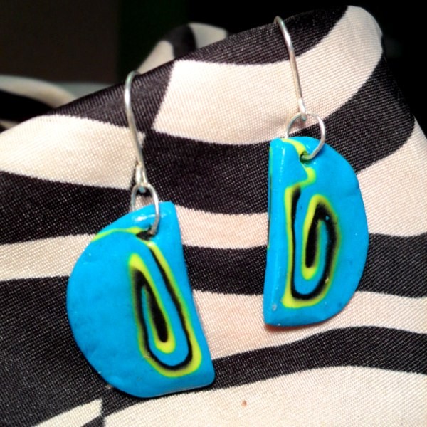 Visiace náušnice vyhotovené ručne z fimo hmoty, postriebreného drôtu a prelakované priesvitným lesklým lakom, veľkosť bez háčika cca 3 cm.