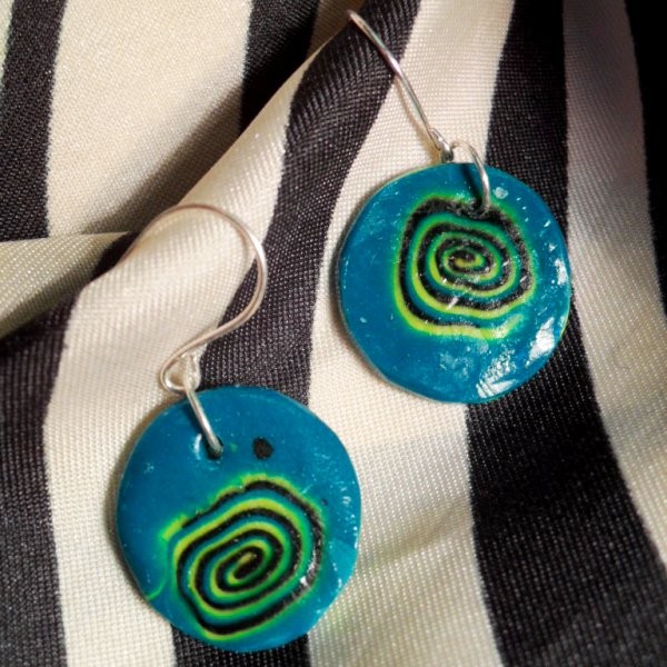 Visiace náušnice vyhotovené ručne z fimo hmoty, postriebreného drôtu a prelakované priesvitným lesklým lakom, veľkosť bez háčika cca 2 cm.