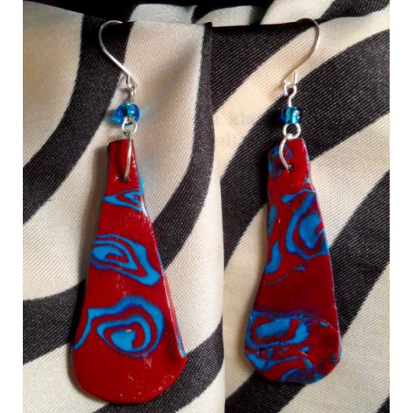 Visiace náušnice vyhotovené ručne z fimo hmoty, postriebreného drôtu, sklenených korálok a prelakované priesvitným lesklým lakom.