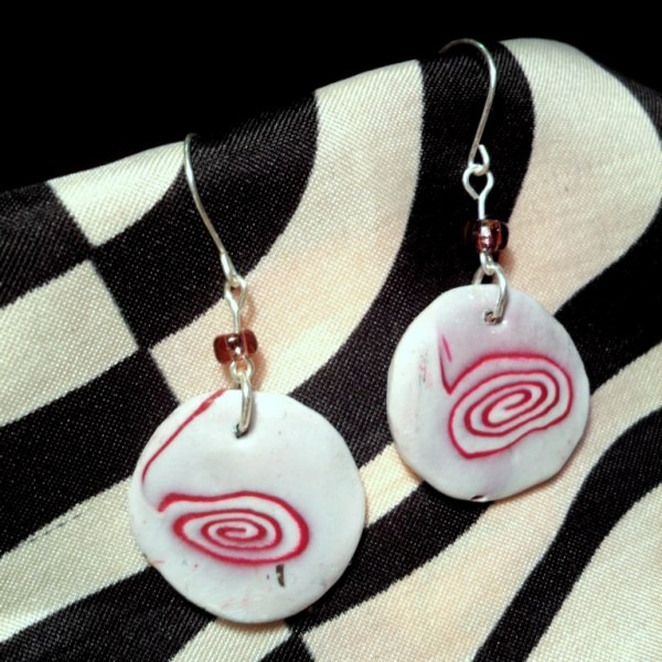 Visiace náušnice vyhotovené ručne z fimo hmoty, postriebreného drôtu, sklenených korálok a prelakované priesvitným lesklým lakom, veľkosť bez háčika cca 3,5 cm.